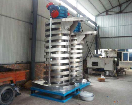 上振式垂直振動提升機驅動裝置的振動電機安裝在輸送塔的下部,兩個振動電機對稱交叉安裝。 輸送塔由管體和焊接在管體周圍的螺旋輸送槽組成。 輸送塔設置在減振裝置上,減振裝置由底座和隔振彈簧組成。